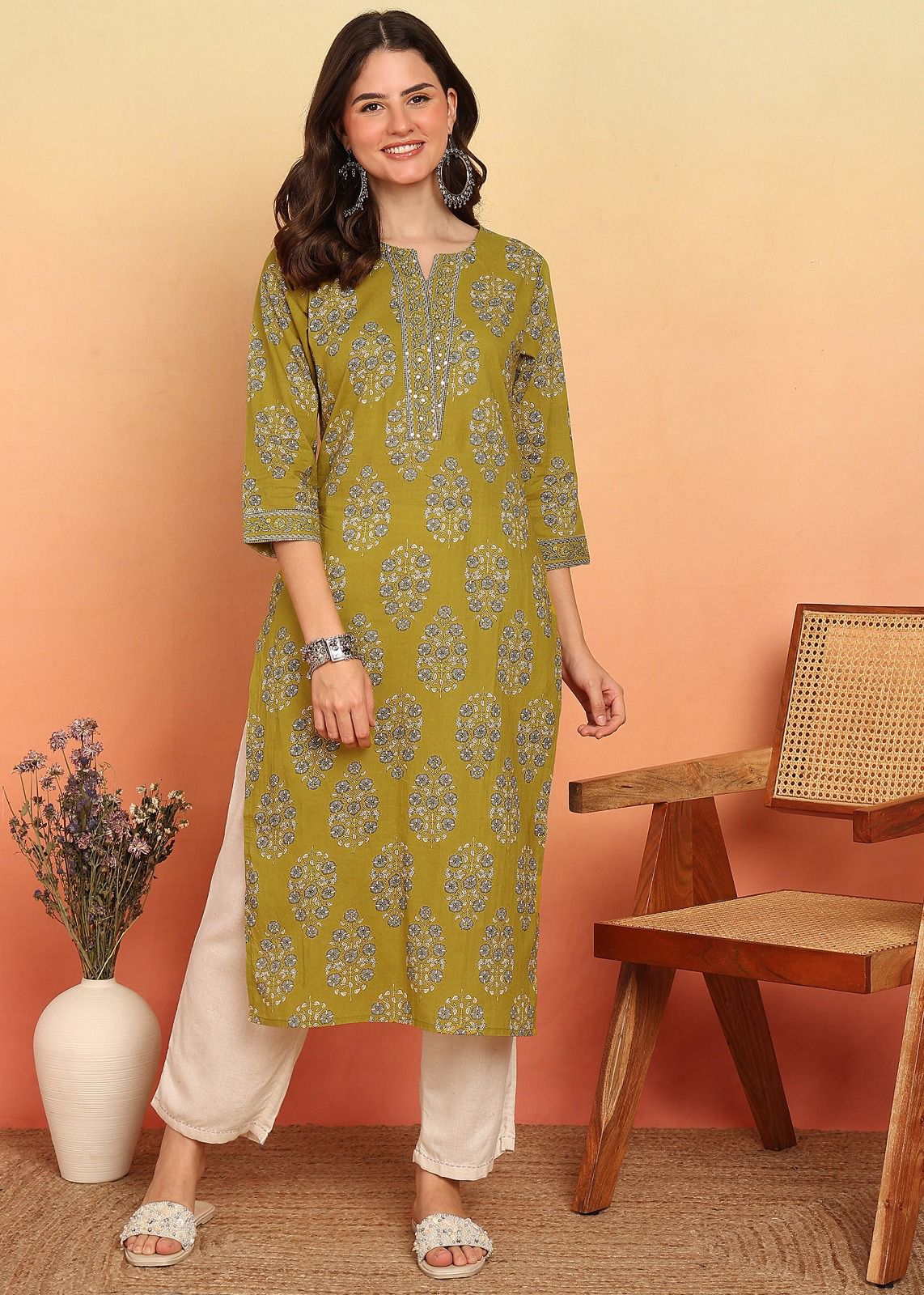 + Free ShippingChic olive-green printed kurti with elegant detailing, soft fabric, and a comfortable straight fit—perfect for everyday style.