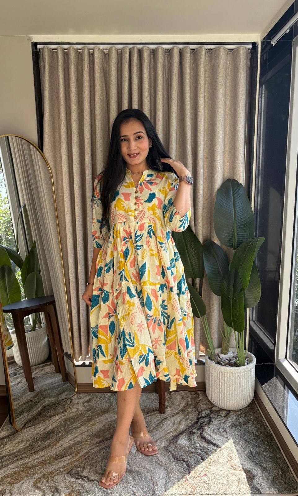 Refresh your everyday wardrobe with this beautiful printed cotton dress, designed for effortless style and all-day comfort. Crafted from soft, breathable cotton, this dress features vibrant floral and leaf prints that add a fresh and lively touch.